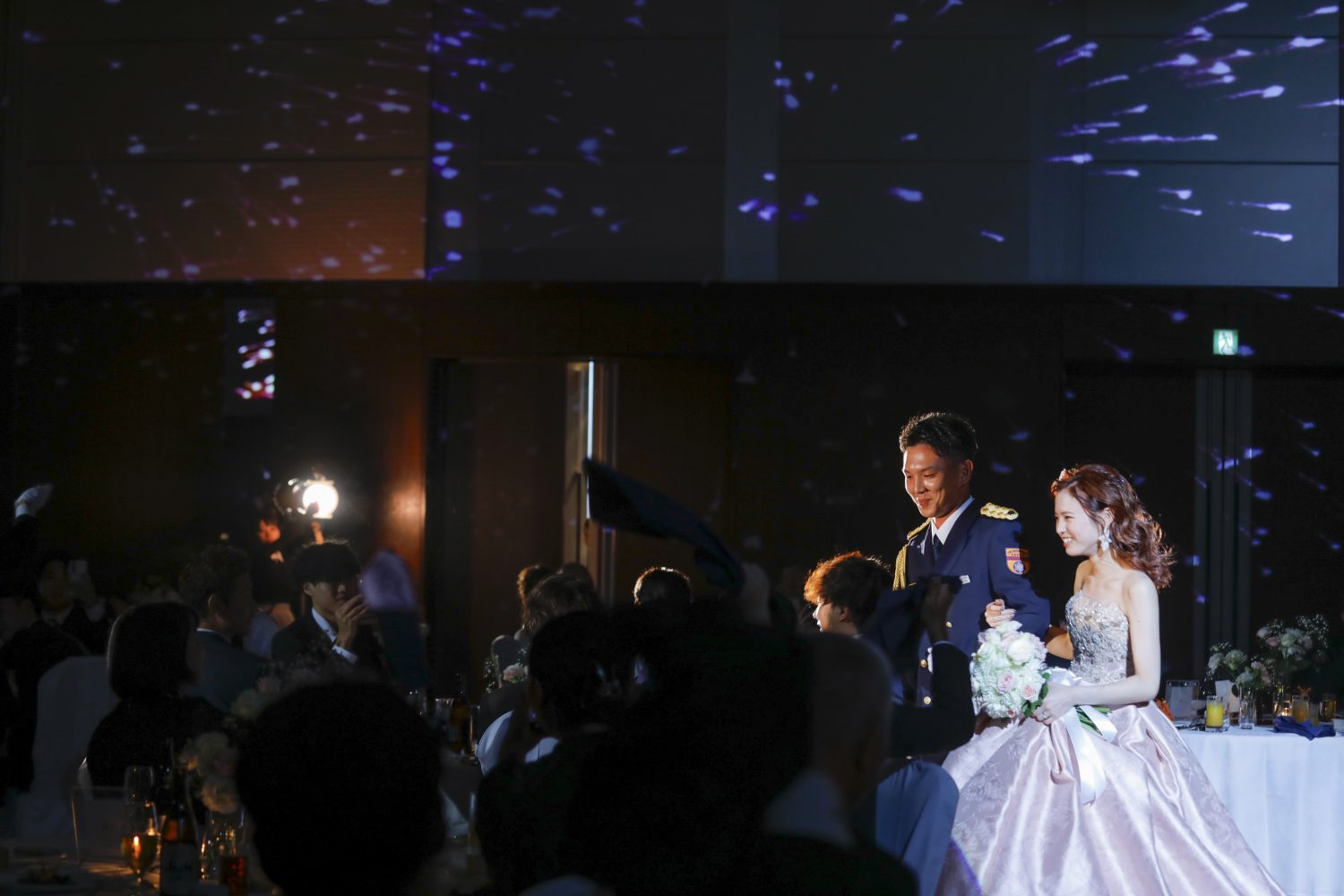 お色直し入場では新郎様はお勤め先の制服に、新婦様は可愛らしいデザインでのドレスでの再入場。ポーズもばっちり決まっています★
