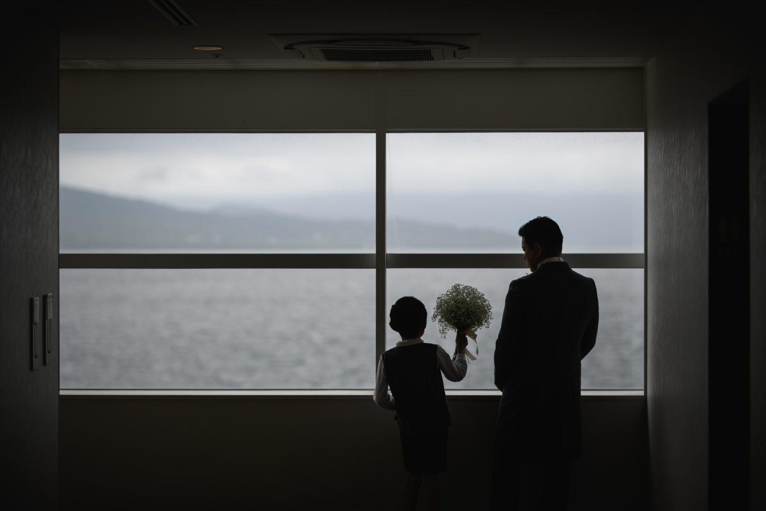 結婚式披露パーティ前の新郎様と息子さん